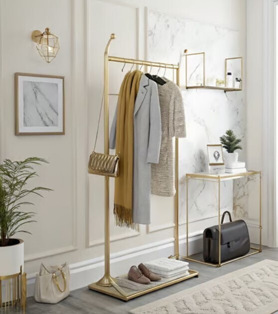 توحيد المواد أو الألوان: إذا اخترت ستاند ملابس بلمسات ذهبية، ابحث عن علاقة جدارية أو إطارات صور أو مزهريات بنفس اللون أو التشطيب المعدني.